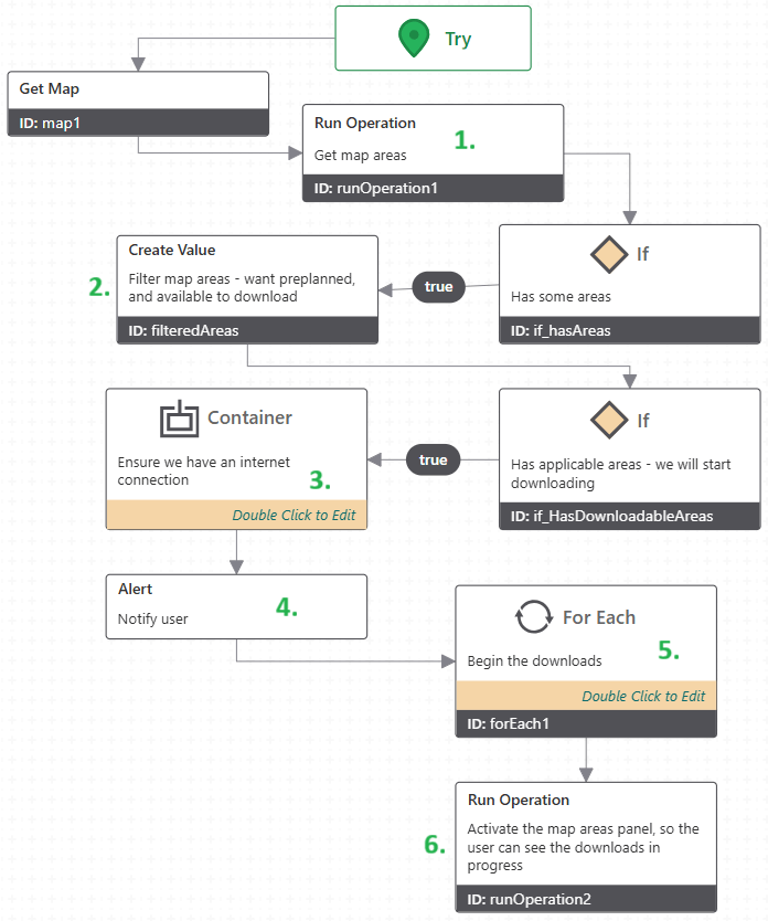 The second Workflow we'll look at deals with preplanned areas. It will check if there are any which have not yet been downloaded. If there are, it notifies the user, automatically begins the download process, and opens the Map Areas panel so the user can monitor the download progress. It can be downloaded for import here.