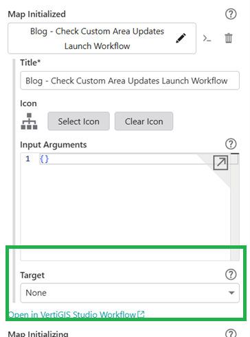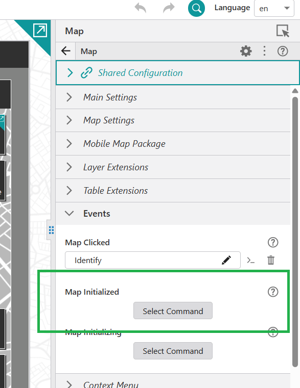 Both of the above Workflows are designed to run from the same point: from the 'Map Initialized' event. This is because the first step, checking for map areas, needs to access the map. The configuration for this can be found in Designer, under the Map Component's Events configuration section.