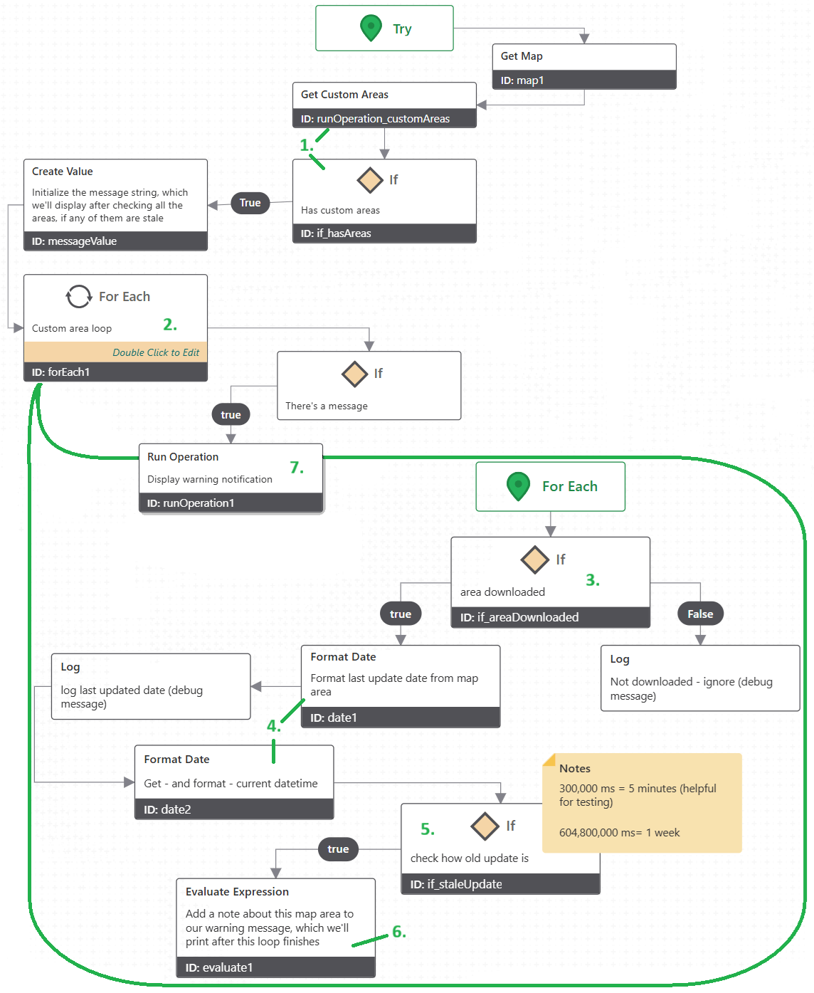 If you wanted to modify this Workflow to also update areas which are already downloaded, you could adjust the filter in Step 2 to include these map areas (see the check from Step 3 in the first Workflow) and call the offline.update-area command in this loop as well.
