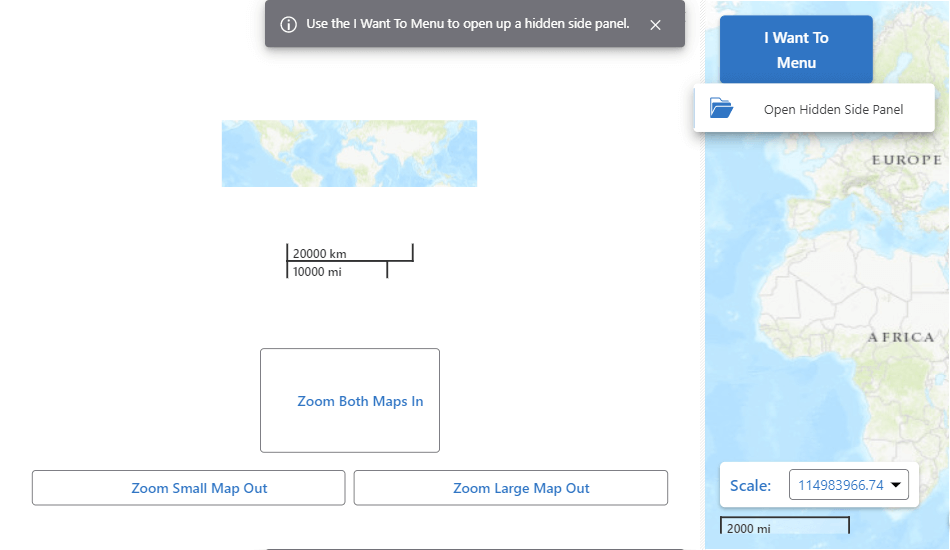 This example demonstrates a web application with a hidden side panel that pops out when you click a button. It was created entirely with app config and layout. Some advanced layout concepts and advanced app config concepts, such as linking config items through item URIs, were used.